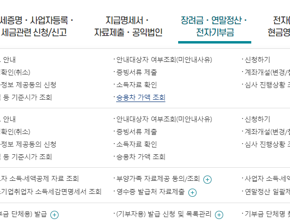 - 상단 메뉴중에 장여금.연말정산.전자기부금을 누르게 되면 하단에 바로 승용차 가액 조회 메뉴가 나타납니다.